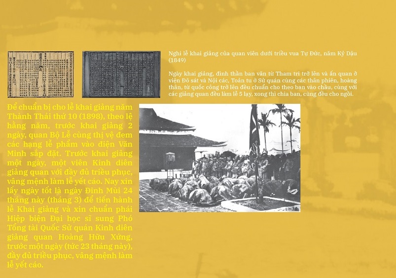 Ngày khai giảng dưới triều Nguyễn được tiến hành theo ngày tốt mà Khâm thiên giám chọn, thông thường sau ngày khai ấn. Công tác chuẩn bị cho lễ khai giảng được thực hiện chu đáo. Nhà vua đích thân khuyên chọn tên của giảng quan sẽ làm lễ yết cáo ở điện Văn Minh. Ngày khai giảng diễn ra trang trọng. Hoàng thượng ngự Kinh diên khai giảng, hôm đó nghỉ thiết triều. Có thể thấy, Lễ Khai giảng dưới triều Nguyễn mang đậm dấu ấn thời đại.